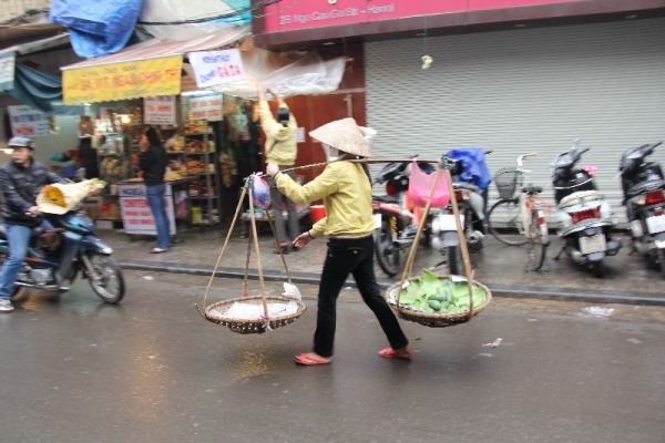 Was man sonst noch so im Getümmel sieht: Frauen mit kegelförmigen Hut, die ihre Waren an einer Stange wie an einer Waage durch die Gegend tragen, und Cyclos, die Touristen durch die Gegend karren: